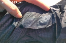 Eine sehr kleines Klebepad ist angebracht wegen eines gezogenen Fadens - also keine Beschädigung, nur Prävention.