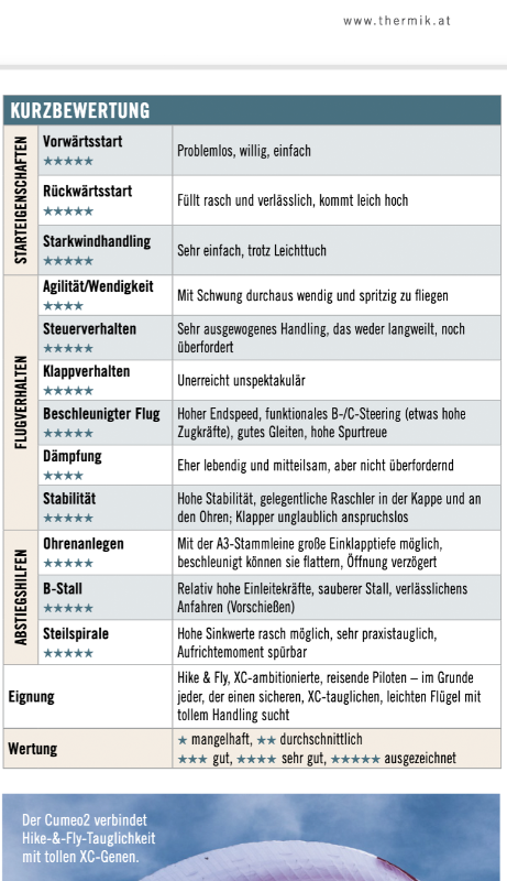 Auf der Seite von Lu Glidz gibt es einen Test vom Chili 5. Gerne schicke ich euch auch den Testbericht des Cumeo 2 aus der Zeitschrift Thermik zu.