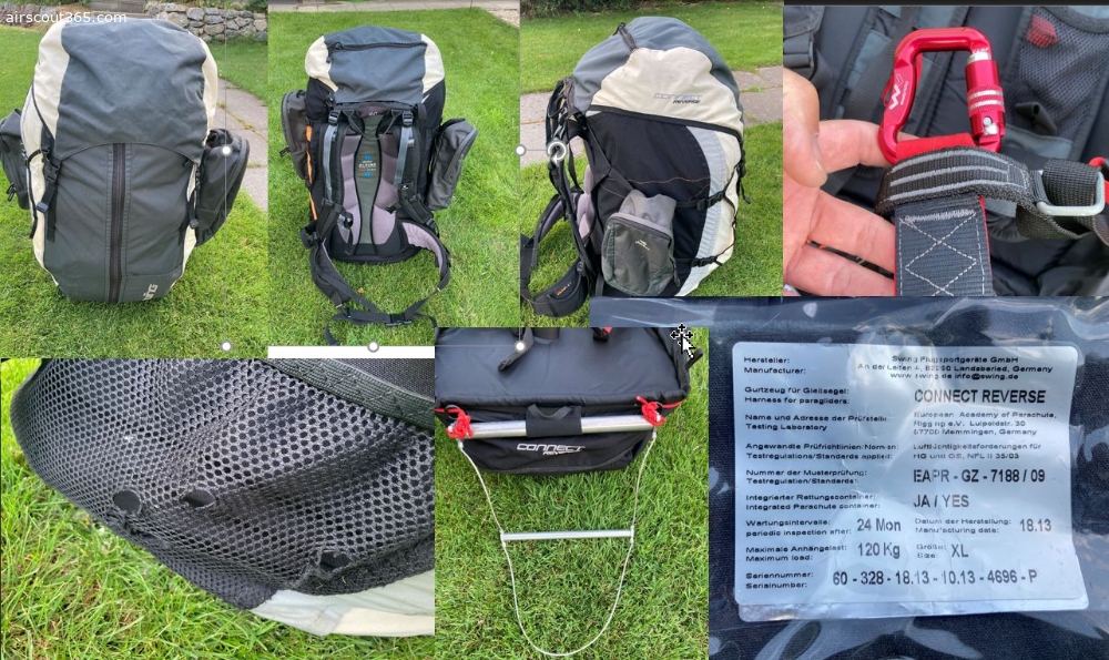 Komplette Ausrüstung zum Gleitschirmfliegen:-Gebrauchtes Wendegurtzeug Swing Connect Reverse, Größe XL, bis 120kg, Baujahr 2013, incl. Karabiner, Hüftgurt, 3 Stufen Beschleuniger, Deckeltasche, Halterung fuer NAVI/Vario, abnehmbare Sidebags (Deuter)