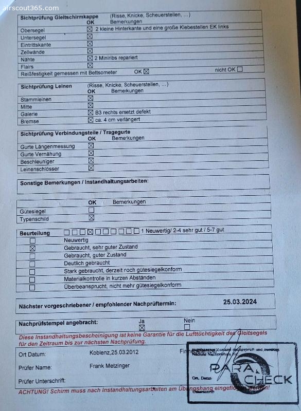 Ergebnis der letzten Nachprüfung am 25.03.2022: gebraucht, sehr guter ZustandLetzter Flug mit dem Schirm war im Juni 2023.